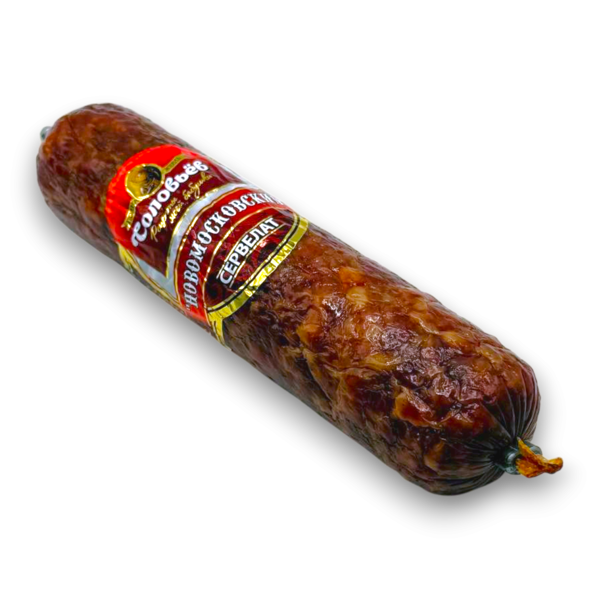 Продукт мясной категории Б, охлажденный Колбаса варено-копченая «Сервелат Новомосковский » СТО 0133531368-001-2018 Состав продукта: говядина высший сорт, свинина нежирная, шпик хребтовой, обваленное мясо кур, вода питьевая, нитритно-посолочная смесь, перец черный молотый, кардамон. Пищевая ценность в 100г продукта (средние значения): Жир - 26г, белок – 14г, углеводы – 0г, энергетическая ценность (калорийность) – 290кКал/1214кДж Срок годности и условия хранения: 30 суток при температуре от 0℃до